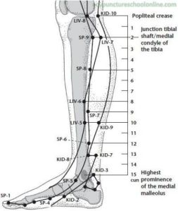 The Crooked Spring acupressure point is located at the inner side at the back of the knee where the crease ends when the knee is bent. The LV 8 point helps with fibroids and swelling in the knee, and knee pain.