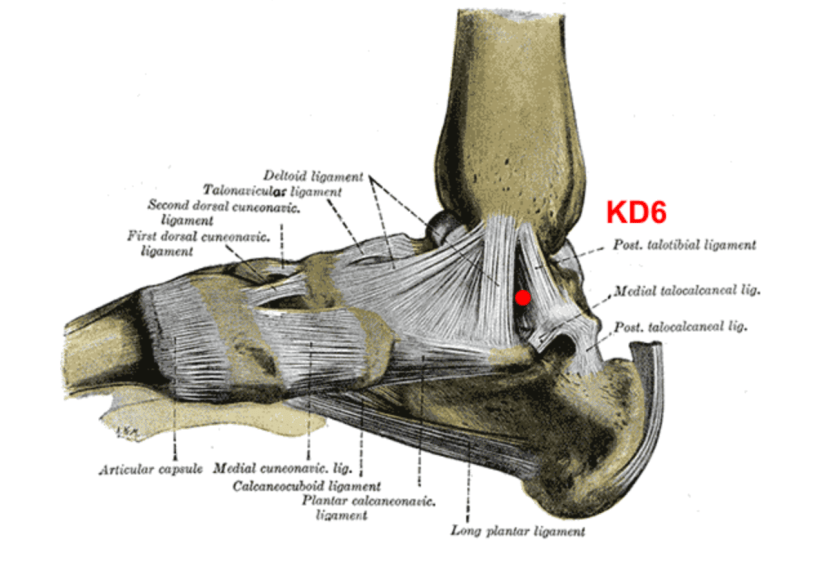 Kidney 6 is a good point in its own right for sore throat, which generally accompanies coughing. Paired with Lung 7 it has a stronger effect, and though I’m currently having a hard time finding this pairing indicated in any texts for cough and cold, we use it on just about every patient that has any respiratory complaints and in our experience it works wonders! KD6 is on the ankle on the medial side (towards the big toe), about an inch below the point of the medial malleolus (ankle bone) in the depression between the two tendons.