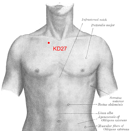 Kidney 27 is in a depression just below the collarbone, about two inches from the midline on an adult. I say on an adult, because in acupuncture and anatomy, all things are proportional to the individual’s own size. Specifically, this point if halfway between the nipple and the midline on each side. This one helps to open the chest, relieve breathing, and boost immunity.