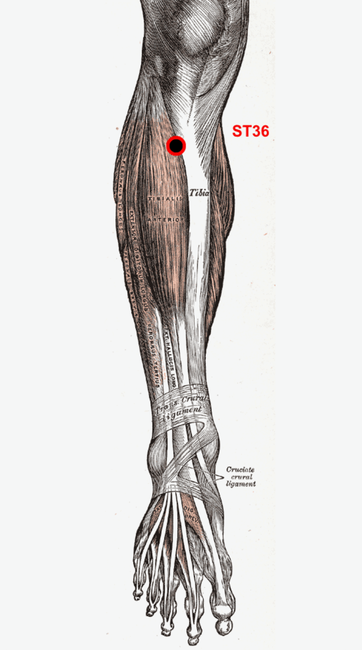 Stomach 36 is probably one of the most used points in acupuncture, it is great for a whole host of things, including boosting energy, aiding digestion, relieving diarrhea, stimulating immune function and even stress relief. Since the pine trees are starting to kick out pollen here in Fort Myers, acupuncturists in the area have likely been using this point a bunch to help keep immune systems in shape. It is on the shin, about one hand-breadth down from the hollow of the knee on the lateral (that’s toward the pinkie toe side) side of the tibia (shin bone) about a half inch from the bone.